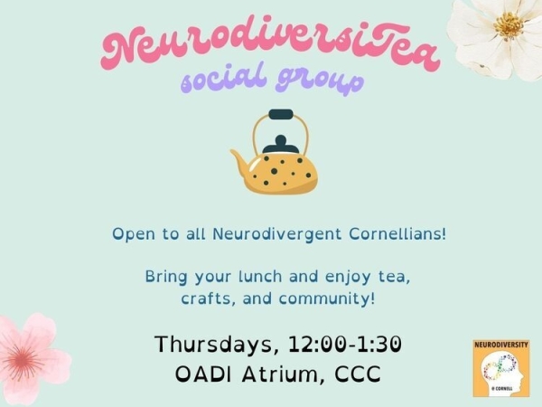 Weekly in-person space for neurodivergent students, staff, faculty and their allies to build community and engage in a neurodiversity-affirming space. Bring your lunch, and come to the 2nd floor atrium of the CCC building for tea, crafts, games and conversation starters!