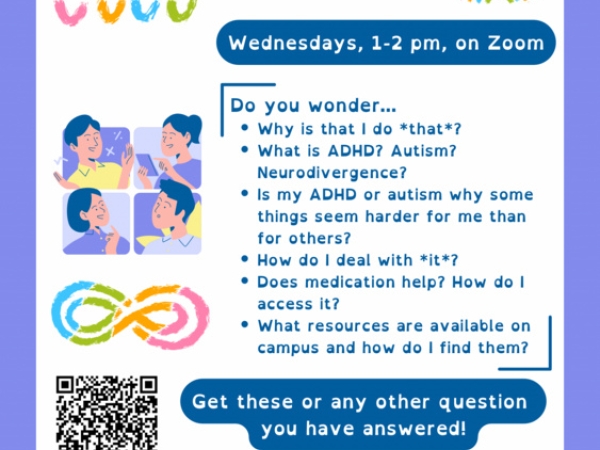 Why is that I do *that*?What is ADHD? Autism? Neurodivergence?Is my ADHD or autism why some things seem harder for then than for others?How do I deal with *it*? Does medication help? How do I access it?What resources are available on campus and how do I find them?Get these or any other question you have answered!